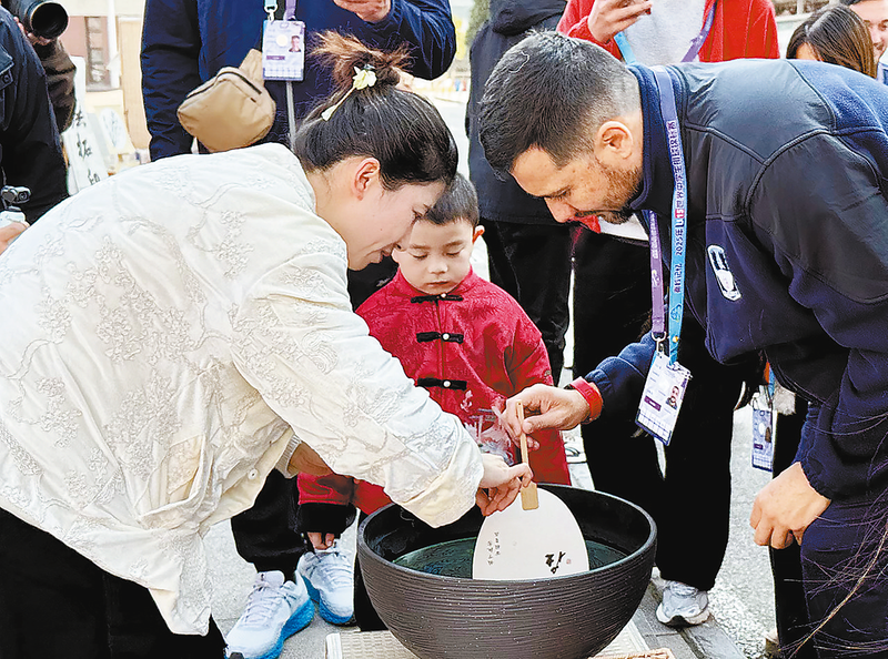 ③12月9日,文化交流日當天,各國運動員走進我市六所學校感受中國文化和體育發展的蓬勃活力。圖為球員在商州區六小感受中國書法和書畫的魅力。