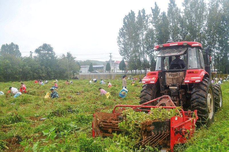 9月4日,在洛南縣景村鎮御史村宏泰金銀花專業合作社的200畝連片黑花生種植基地內,一位村民駕駛拖拉機進行機械采挖,100多名村民正在進行人工采摘。這些村民在基地務工,每天可以掙到100元左右的工錢。