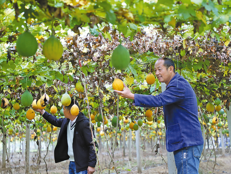 店坊河村村民劉湘琴用雙手輕輕一掰,就將藤蔓上瓜蔞分開一條裂縫,麻利地將瓜籽挖出,再將瓜蔞皮一分為二背靠背晾曬在藤上。“成熟的瓜蔞先不著急摘下來,掏出瓜籽后,自然風干的瓜皮可以入藥。”劉湘琴說,“我60多歲了,平時在家干完家務,就到離家不遠的種植基地干點農活,每天有80元的收入。一年四季在家門口干些零星活兒,也能掙幾千元哩!”
