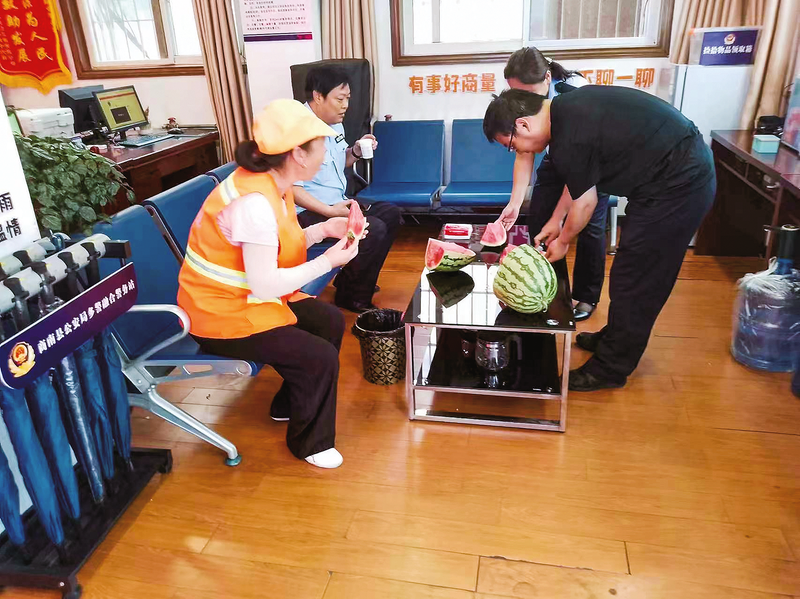 “馮姨進來坐,我給您拿報紙,邊看邊喝茶。”值班民警老劉熱情地招呼著。8月20日16時許,馮某來到“暖心警務會客廳”,手上拿著印有“雨雪紛紛下單鹿警為您送傘”字樣的雨傘,微笑著說:“前幾天回家時雨太大了,路過這兒時,民警借給我了一把傘,今天特意來歸還,謝謝你們?!瘪T某是這兒的“常客”,因征地拆遷等問題,多次向相關部門反映情況,每次值班民輔警在得知情況后,將其接到“暖心警務會客廳”,動之以情、曉之以理,耐心講解相關法律法規,勸說其要文明理智維權,依法依規信訪。后來,大家也逐漸熟絡起來,有時民輔警在街上巡邏時遇見她就邀請到“暖心警務會客廳”坐坐,聊聊家常。