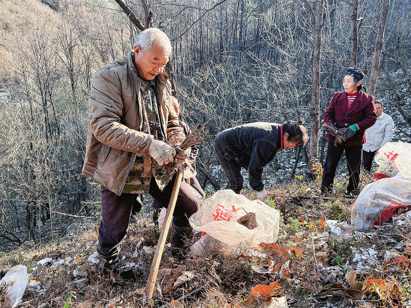 11月19日,商南縣富水鎮黃土凸村的山壟間,初雪未融,山風裹著幾分凜冽,卻擋不住林地陰坡上的熱鬧。一群村民手持鋤頭、提著鼓囊囊的小通草樹苗袋,彎腰、刨坑、放苗、培土,動作嫻熟利落。新栽的幼苗在殘雪映襯下,透著勃勃生機。這是黃土凸村種下小通草的第二年,也是這個藏在深山里的村落掙脫“增收難”枷鎖、改寫發展軌跡的關鍵契機。