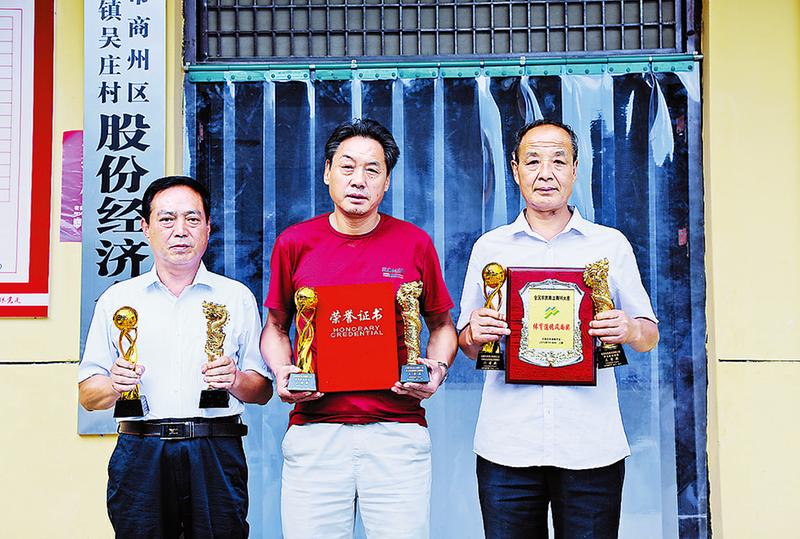 村干部展示在全國(guó)農(nóng)民舞龍舞獅大賽上獲得的獎(jiǎng)杯和證書(shū)