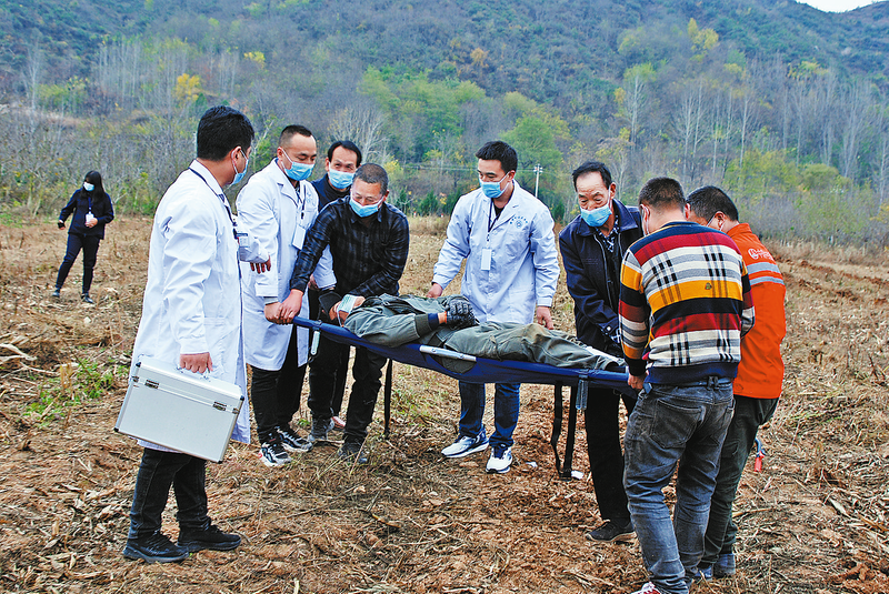 演練開始,只見一名機手操作微耕機在田地里作業,突然發生事故倒地不起。附近一村民聽見呼救聲,趕來查看情況,發現機手腿部受傷嚴重,迅速撥打120急救電話請求救援。同時,一村民撥打商州區農機中心24小時值班電話報案。醫護人員趕到現場對受傷機手進行緊急處置,并送往醫院救治。此時,商州區農機中心負責同志帶上兩名事故處理員組成事故處理組趕赴現場,并在途中通知商州交警大隊大荊中隊赴現場協助處置。在事故勘察過程中,交警封鎖事故現場,事故處理員向目擊群眾出示了相關證件,詢問調查事故發生經過,做了詢問筆錄……