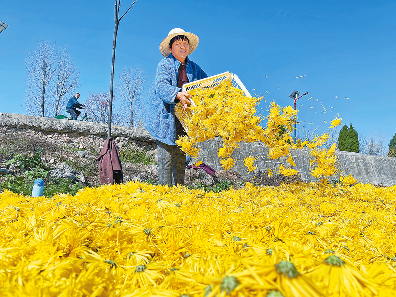 秋菊有佳色,裛露掇其英。11月15日,走進商州區腰市鎮泉村的盛世興農種植示范基地,黃色、白色的菊花競相綻放,形成一片花海,香氣撲鼻,令人陶醉。村民井然有序地采摘、晾曬菊花,一派繁忙景象。