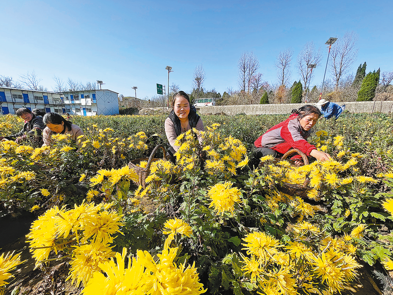 “我們種植了50畝金絲皇菊和杭白菊,采摘時間從11月開始,整個花期約一個月,這次按照成熟度,先采摘金絲皇菊。”盛世興農種植示范基地管理人員介紹,今年4月份基地栽種菊花幼苗,經過培土、起壟、施肥、移栽、滴灌、蓋地膜等流程,菊花在11月份成熟,預計金絲皇菊、杭白菊畝產分別在1000公斤、1100公斤,年收益28萬元左右,直接帶動周邊200多名村民就近就業增收。