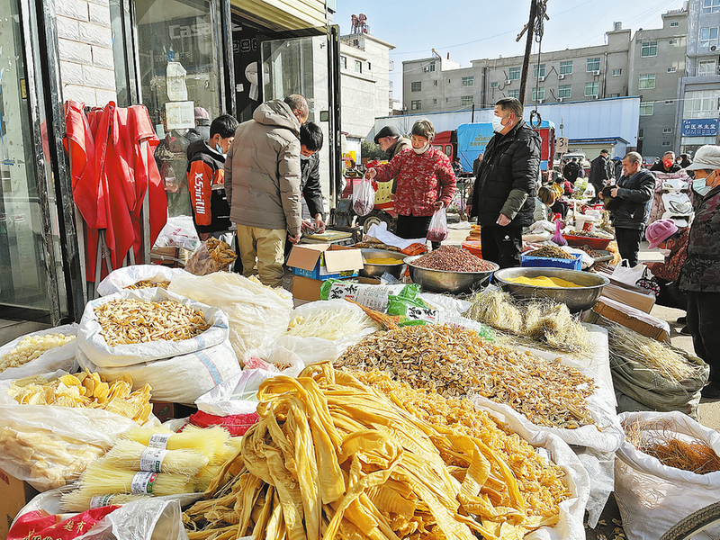 一家攤位前銀耳、腐竹、粉條等干貨琳瑯滿目。
