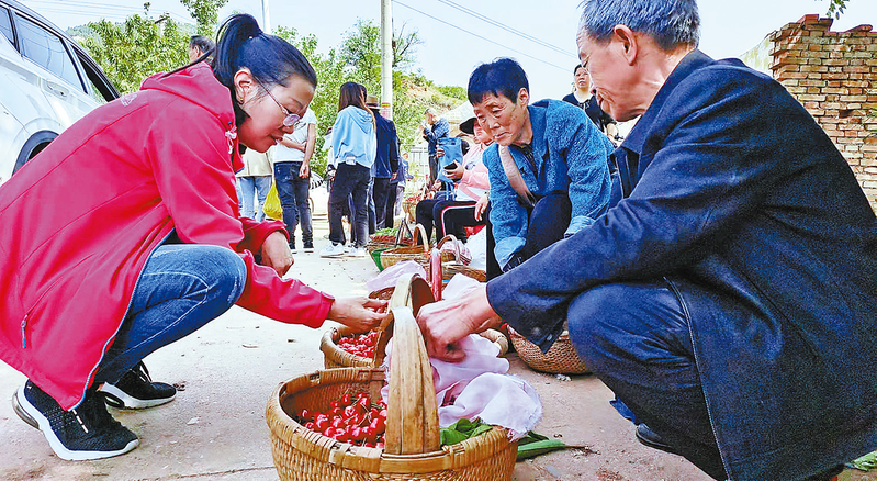 在村中大路邊的櫻桃市場,村民提著電子秤、拿著小板凳,兜賣剛剛采摘的櫻桃。一顆顆鮮嫩的果實吸引著專程前來的游客品嘗購買。