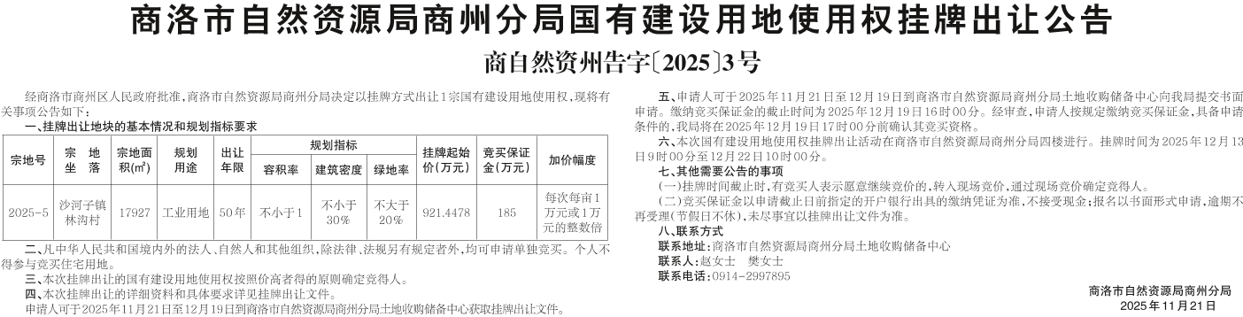 商洛市自然資源局商州分局國有建設用地使用權掛牌出讓公告