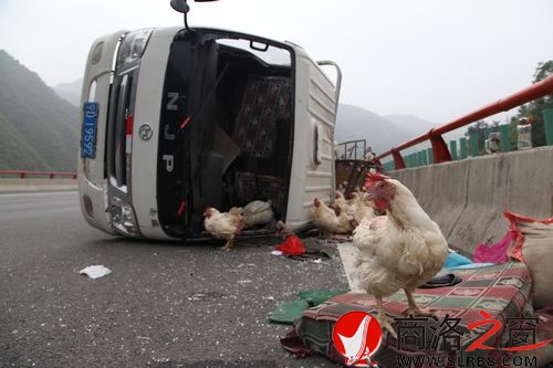 商洛日報訊(記者 楊鑫)7月22日上午九點半左右,一輛滿載肉雞的寧夏牌照小貨車在滬陜高速1339公里丹鳳縣白家灣隧道外高架橋上側翻,無人員傷亡,但一千多只肉雞大部分甩入橋下喪生。