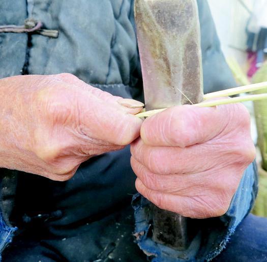 說著,一根根竹篾就在他的手中熟練的翻飛,記者注意到老人的手上長滿老繭,非常粗糙。“都是做這個磨的,才學的時候,經常被竹子劃傷手,手上經常是傷痕累累,花了一年多的時間才適應。”老人說,他家的坡上有一畝地的竹園,編篾筐的材料用的都是自家的竹子。編篾筐首先要把竹子劈成細條,這是一個技術活,也是編好蔑筐的一個重要環節;然后根據要做的物件進行編制。他說,做竹器最重要的還是得有耐心,能坐得住,他的兒子和16歲的小孫子都會做,但因為銷路問題,想靠這個謀生也不現實了,還有重要的一點就是他們根本耐不住性子,自然也就不愿意做了。老人很悲傷地說,看來編制篾筐的手藝在不久的將來將會失傳的。