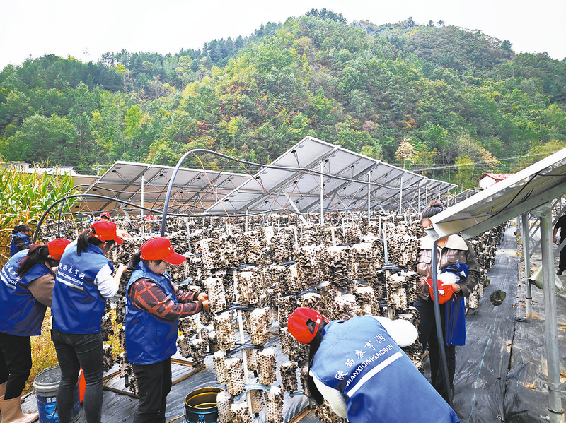 初冬的早晨,暖陽下的鎮安縣大坪鎮廟溝村農光互補塔式木耳種植基地景色格外迷人:一塊塊藍色光伏面板折射出萬千條耀眼光芒,生產的綠色電能正輸送到附近的豐菇源產業園區;一排排整齊的塔架上,密密麻麻的黑木耳正沐陽而生;三五成群的婦女一邊說笑,一邊嫻熟地采摘肉嘟嘟的鮮耳。