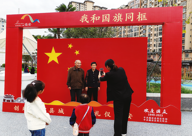2023年國慶節,群眾與國旗同框。